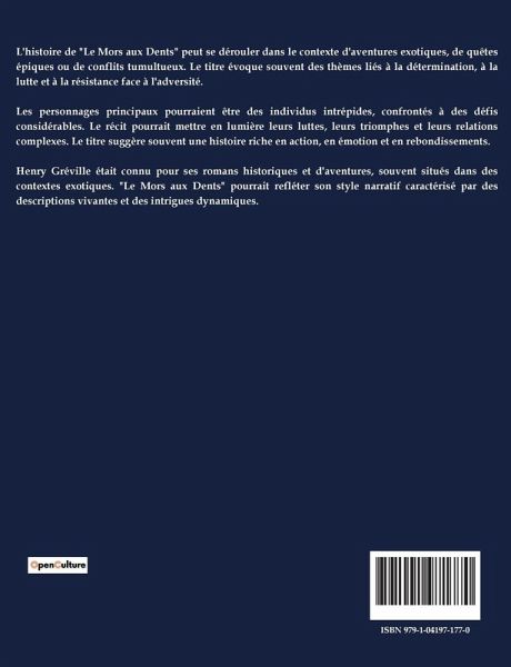 Un vent de révolte souffle sur les pages de ' Le Mors aux Dents ', une uvre où les passions humaines se heurtent aux conventions sociales. Dans un cadre empreint de tensions et de désirs inassouvis, Henry Greville nous transporte dans une société où les apparences règnent en maîtres. L'intrigue se déroule à une époque où les changements personnels et les attentes collectives s'entrechoquent, révélant les failles d'un monde en quête de stabilité. Les personnages, pris dans un tourbillon d'émotions, naviguent entre devoir et désir, offrant au lecteur une fresque vivante des complexités humaines. À travers cette analyse psychologique, Greville explore les thèmes de l'amour, de la liberté et de la rébellion. Les protagonistes, animés par une volonté farouche de s'affranchir des chaînes invisibles qui les entravent, incarnent la lutte éternelle entre l'individu et la société. Leurs parcours, marqués par des choix déchirants et des sacrifices, illustrent la quête incessante de sens et d'identité. En développant une narration riche en détails et en émotions, ce livre nous apprend à mieux comprendre les évolutions sociales et les motivations variées qui animent les êtres humains. Par une observation minutieuse des interactions et des conflits, nous percevons désormais mieux les enjeux universels de la condition humaine. ' Le Mors aux Dents ' n'est pas seulement une histoire, mais un miroir tendu vers nos propres aspirations et contradictions.