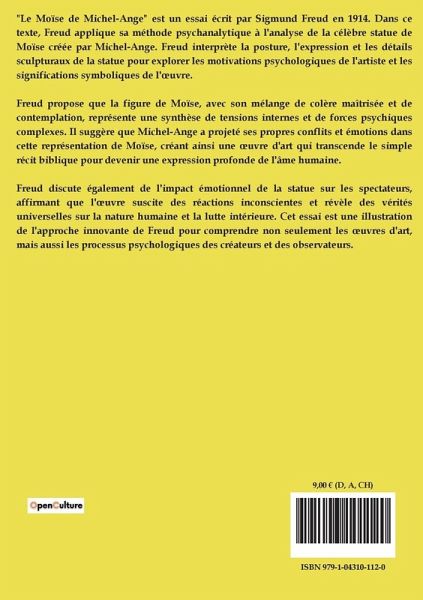 "Le Moïse de Michel-Ange" est un essai écrit par Sigmund Freud en 1914. Dans ce texte, Freud applique sa méthode psychanalytique à l'analyse de la célèbre statue de Moïse créée par Michel-Ange. Freud interprète la posture, l'expression et les détails sculpturaux de la statue pour explorer les motivations psychologiques de l'artiste et les significations symboliques de l'¿uvre. Freud propose que la figure de Moïse, avec son mélange de colère maîtrisée et de contemplation, représente une synthèse de tensions internes et de forces psychiques complexes. Il suggère que Michel-Ange a projeté ses propres conflits et émotions dans cette représentation de Moïse, créant ainsi une ¿uvre d'art qui transcende le simple récit biblique pour devenir une expression profonde de l'âme humaine. Freud discute également de l'impact émotionnel de la statue sur les spectateurs, affirmant que l'¿uvre suscite des réactions inconscientes et révèle des vérités universelles sur la nature humaine et la lutte intérieure. Cet essai est une illustration de l'approche innovante de Freud pour comprendre non seulement les ¿uvres d'art, mais aussi les processus psychologiques des créateurs et des observateurs.