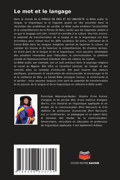 Dans le monde de la PAROLE DE DIEU ET DU LINGUISTE, la Bible audio, la langue, la linguistique et le linguiste jouent un rôle essentiel dans la résolution des problèmes de société. La Bible audio améliore l'accessibilité et la compréhension de la Parole de Dieu, tandis que les linguistes veillent à ce que le langage soit clair, inclusif et sensible à la culture. Une fois encore, le potentiel de transformation de la langue et de la linguistique est très prometteur pour relever tous les défis sociétaux. En outre, l'utilisation de la Sainte Bible dans les langues indigènes permet de façonner la culture, de combler les fossés et de favoriser la compréhension. En d'autres termes, en tirant parti de la langue et de la linguistique, nous pouvons développer des solutions innovantes pour l'éducation, la communication, la cohésion sociale et l'épanouissement individuel dans les nations du monde.La Bible audio, par exemple, est un outil précieux dans le paysage religieux et social du Nigeria. Elle offre un réconfort spirituel, de l'espoir et des conseils dans un contexte d'insécurité. Elle peut inspirer des valeurs pacifiques, promouvoir la construction de communautés et encourager la foi et la confiance en Dieu. La Sainte Bible enseigne l'amour, la miséricorde et le pardon ; nous pouvons toujours tirer parti du potentiel de transformation et du pouvoir de la langue et de la linguistique en utilisant la Bible audio.