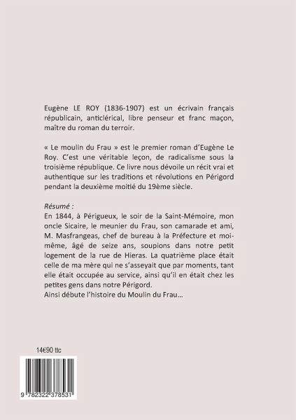 "Le Moulin du Frau" est le premier roman d'Eugène LE ROY.Ce beau roman est une peinture, étonnante de vérité et de couleur, de la vie campagnarde périgourdine.Il nous dévoile un récit vrai et authentique sur les traditions et révolutions en Périgord durant la deuxième moitié du 19ème siècle: le radicalisme sous la troisième république.Résumé:1844 en Périgord, le soir de la Saint-Mémoire, se retrouvent à table pour souper dans notre petit logement de la rue de Hieras, mon oncle Sicaire, le meunier du Frau, son ami, Monsieur Masfrangeas, chef de bureau à la préfecture, moi-même âgé de seize ans. La quatrième place vide est celle de ma mère qui ne s'asseyait que par moments, étant occupée au service, ainsi qu'il en était chez les petites gens dans notre Périgord.Ainsi commence l'histoire du Moulin de Frau...