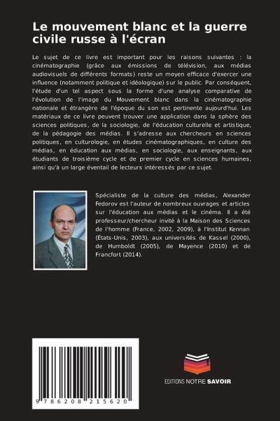 Le sujet de ce livre est important pour les raisons suivantes : la cinématographie (grâce aux émissions de télévision, aux médias audiovisuels de différents formats) reste un moyen efficace d'exercer une influence (notamment politique et idéologique) sur le public. Par conséquent, l'étude d'un tel aspect sous la forme d'une analyse comparative de l'évolution de l'image du Mouvement blanc dans la cinématographie nationale et étrangère de l'époque du son est pertinente aujourd'hui. Les matériaux de ce livre peuvent trouver une application dans la sphère des sciences politiques, de la sociologie, de l'éducation culturelle et artistique, de la pédagogie des médias. Il s'adresse aux chercheurs en sciences politiques, en culturologie, en études cinématographiques, en culture des médias, en éducation aux médias, en sociologie, aux enseignants, aux étudiants de troisième cycle et de premier cycle en sciences humaines, ainsi qu'à un large éventail de lecteurs intéressés par ce sujet.