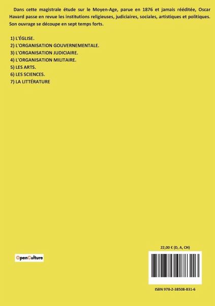 Dans cette magistrale étude sur le Moyen-Age, parue en 1876 et jamais rééditée, Oscar Havard passe en revue les institutions religieuses, judiciaires, sociales, artistiques et politiques. Son ouvrage se découpe en sept temps forts. 1) L'ÉGLISE. 2) L'ORGANISATION GOUVERNEMENTALE. 3) L'ORGANISATION JUDICIAIRE. 4) L'ORGANISATION MILITAIRE. 5) LES ARTS. 6) LES SCIENCES. 7) LA LITTÉRATURE