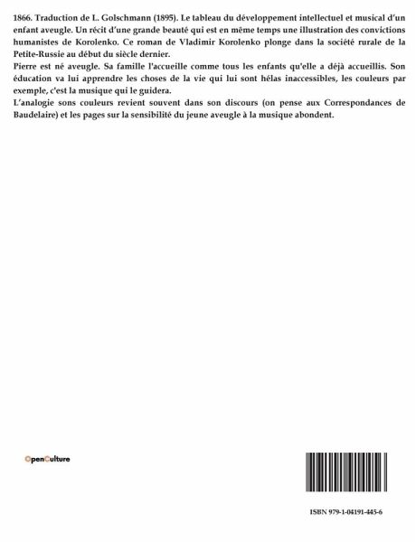 1866. Traduction de L. Golschmann (1895). Le tableau du développement intellectuel et musical d¿un enfant aveugle. Un récit d¿une grande beauté qui est en même temps une illustration des convictions humanistes de Korolenko. Ce roman de Vladimir Korolenko plonge dans la société rurale de la Petite-Russie au début du siècle dernier. Pierre est né aveugle. Sa famille l'accueille comme tous les enfants qu'elle a déjà accueillis. Son éducation va lui apprendre les choses de la vie qui lui sont hélas inaccessibles, les couleurs par exemple, c'est la musique qui le guidera. L¿analogie sons couleurs revient souvent dans son discours (on pense aux Correspondances de Baudelaire) et les pages sur la sensibilité du jeune aveugle à la musique abondent.