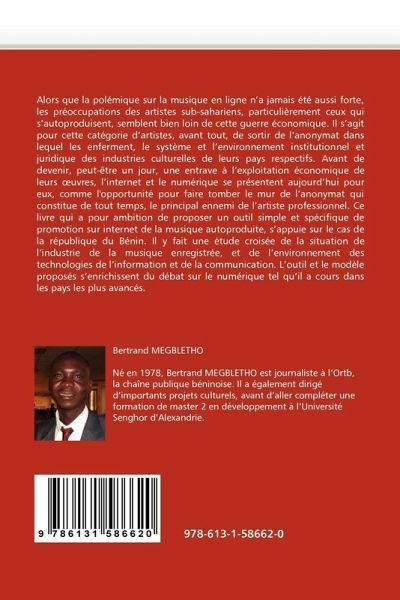 Alors que la polémique sur la musique en ligne n'a jamais été aussi forte, les préoccupations des artistes sub-sahariens, particulièrement ceux qui s'autoproduisent, semblent bien loin de cette guerre économique. Il s'agit pour cette catégorie d'artistes, avant tout, de sortir de l'anonymat dans lequel les enferment, le système et l'environnement institutionnel et juridique des industries culturelles de leurs pays respectifs. Avant de devenir, peut-être un jour, une entrave à l'exploitation économique de leurs oeuvres, l'internet et le numérique se présentent aujourd'hui pour eux, comme l'opportunité pour faire tomber le mur de l'anonymat qui constitue de tout temps, le principal ennemi de l'artiste professionnel. Ce livre qui a pour ambition de proposer un outil simple et spécifique de promotion sur internet de la musique autoproduite, s'appuie sur le cas de la république du Bénin. Il y fait une étude croisée de la situation de l'industrie de la musique enregistrée, et de l'environnement des technologies de l'information et de la communication. L'outil et le modèle proposés s'enrichissent du débat sur le numérique tel qu'il a cours dans les pays les plus avancés.