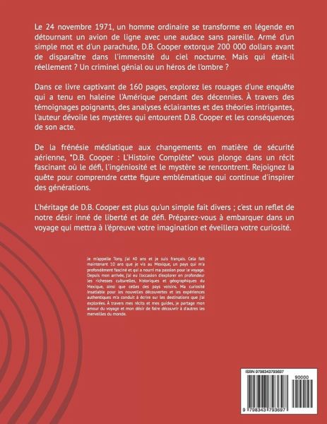 plongez dans l'une des énigmes les plus captivantes de l'histoire criminelle américaine. À travers une recherche exhaustive, ce livre de 160 pages retrace le détournement audacieux d'un avion de ligne le 24 novembre 1971, lorsqu'un homme mystérieux, connu sous le nom de D.B. Cooper, a pris en otage un Boeing 727. Armé d'une simple menace, il a réussi à extorquer une rançon de 200 000 dollars avant de disparaître dans la nuit, laissant derrière lui une traîne d'interrogations et de spéculations. L'auteur, avec un style captivant et une rigueur journalistique, présente chaque étape de cette affaire emblématique. Le livre commence par un récit détaillé des événements du jour du détournement, illustrant le climat social et politique des années 1970, marqué par une montée de la criminalité et une méfiance croissante envers les institutions. Chaque chapitre explore les témoins, les enquêteurs et les pistes menant à des suspects, tout en intégrant des éléments de culture populaire qui ont façonné la légende de Cooper. Le lecteur découvrira les différentes théories sur l'identité de Cooper, de ses origines à ses motivations, tout en naviguant à travers le labyrinthe des investigations du FBI. Avec une plume riche et descriptive, l'auteur donne vie à une histoire qui transcende le simple acte criminel pour devenir un symbole de défi et d'ingéniosité humaine. En outre, le livre aborde les implications de l'affaire sur la sécurité aérienne et la culture populaire, montrant comment D.B. Cooper est devenu un héros pour certains et un criminel pour d'autres. À travers des anecdotes fascinantes, des analyses psychologiques et des réflexions sur la société, *D.B. Cooper: L'Histoire Complète* offre une perspective unique sur un mystère non résolu qui continue de hanter l'imaginaire collectif. Que vous soyez un passionné d'histoires criminelles, un amateur d'aviation ou simplement curieux de découvrir comment un acte de rébellion a marqué l'histoire, ce livre vous tiendra en haleine jusqu'à la dernière page, vous laissant réfléchir sur la nature même du mystère.
