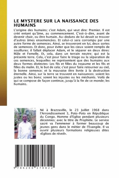 L'origine des humains; c'est Adam, qui veut dire: Premier. Il est créé entant qu'âme, au commencement. C'est-à-dire, avant de devenir chair, ou être humain. Au-dedans de lui devait se trouver d'autres âmes ensemencées. Et celui-ci sera corrompu par une autre forme de semences. Ainsi, se trouveront en lui, deux sortes de semences. Et donc, pour éviter que les cieux soient remplis de souillures; il fallait déplacer Adam, et le séparer en deux êtres: Mâle et Femelle. Et, cela, dans un terrain neutre; qui est la présente terre. Cela, c'est pour faire le triage ou la séparation de ces semences, lesquelles ne représentent que des humains aux deux formes distinctes: Les fils et filles du royaume et les fils et filles du malin. Et, le but de cela; c'est pour faire retourner au ciel, la bonne semence; et la mauvaise être livrée à la destruction éternelle. Ainsi, sur la terre se trouvent en naissances; soient les justes ou les bons; soient les injustes ou les méchants. Voilà de qui se compose de façon continue, jusqu'à la fin de ce monde; les humains.