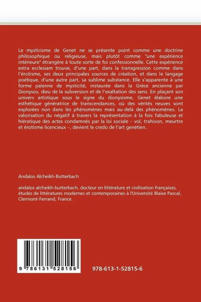 Le mysticisme de Genet ne se présente point comme une doctrine philosophique ou religieuse, mais plutôt comme "une expérience intérieure" étrangère à toute sorte de foi confessionnelle. Cette expérience extra ecclesiam trouve, d une part, dans la transgression comme dans l érotisme, ses deux principales sources de création, et dans le langage poétique, d une autre part, sa sublime substance. Elle s apparente à une forme païenne de mysticité, instaurée dans la Grèce ancienne par Dionysos, dieu de la subversion et de l exaltation des sens. En plaçant son univers artistique sous le signe du dionysisme, Genet élabore une esthétique génératrice de transcendances, où des vérités neuves sont explorées non dans les phénomènes mais au-delà des phénomènes. La valorisation du négatif à travers la représentation à la fois fabuleuse et hiératique des actes condamnés par la loi sociale vol, trahison, meurtre et érotisme licencieux , devient le credo de l art genétien.