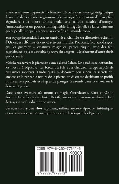 Elara, une jeune apprentie alchimiste, découvre un message énigmatique dissimulé dans un ancien grimoire. Ce message fait mention d'un artefact légendaire : la pierre philosophale, une relique capable d'octroyer l'immortalité et un pouvoir inimaginable. Intriguée, elle se lance dans une quête périlleuse qui la mènera aux confins du monde connu. Son voyage la conduit à travers une forêt enchantée, où elle croise le chemin d'Orion, un elfe mystérieux et réticent à l'aider. Pourtant, face aux dangers qui les guettent - créatures magiques, pactes risqués avec des fées capricieuses, et la redoutable épreuve du dragon -, ils n'auront d'autre choix que de s'unir. Mais la route vers la pierre est semée d'embûches. Une trahison inattendue les mettra à l'épreuve, les forçant à fuir et à chercher refuge auprès de puissantes sorcières. Tandis qu'Elara découvre peu à peu les secrets des anciens et la véritable nature de la pierre, un dilemme déchirant se profile : utiliser son pouvoir et risquer de plonger le monde dans le chaos, ou la détruire à jamais. Dans cette aventure où amour et magie s'entrelacent, Elara et Orion devront faire face à des choix décisifs, mettant en jeu non seulement leur destin, mais celui du monde entier. Un romantasy one-shot captivant, mêlant mystère, épreuves initiatiques et une romance envoûtante qui transcende le temps et les légendes.