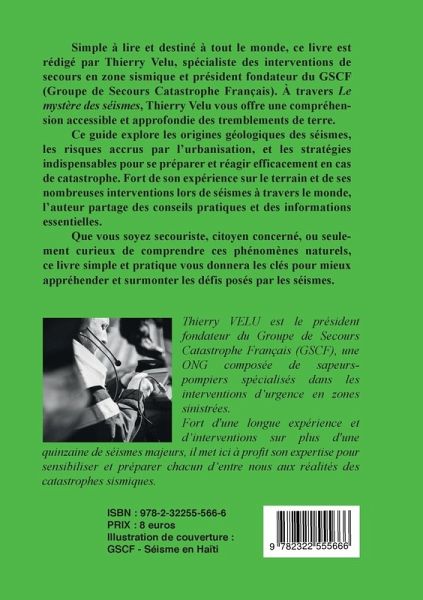 Simple à lire et destiné à tout le monde, ce livre est rédigé par Thierry Velu, spécialiste des interventions de secours en zone sismique et président fondateur du GSCF (Groupe de Secours Catastrophe Français). À travers Le mystère des séismes, Thierry Velu vous offre une compréhension accessible et approfondie des tremblements de terre. Ce guide explore les origines géologiques des séismes, les risques accrus par l'urbanisation, et les stratégies indispensables pour se préparer et réagir efficacement en cas de catastrophe. Fort de son expérience sur le terrain et de ses nombreuses interventions lors de séismes à travers le monde, l'auteur partage des conseils pratiques et des informations essentielles. Que vous soyez secouriste, citoyen concerné, ou seulement curieux de comprendre ces phénomènes naturels, ce livre simple et pratique vous donnera les clés pour mieux appréhender et surmonter les défis posés par les séismes.
