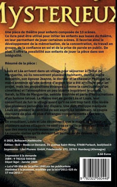 Une pièce de théâtre pour enfants composée de 13 scènes. Ce livre peut être utilisé pour initier les enfants aux bases du théâtre, en leur permettant de jouer certaines scènes. Il favorise ainsi le développement de la mémorisation, de la concentration, du travail en groupe, de la confiance en soi et de la prise de parole en public. De plus, il offre la possibilité aux enfants de jouer la pièce dans son intégralité. Résumé de la pièce : Louis et Léa arrivent dans un village pour séjourner à l'hôtel de Marguerite, où ils rencontrent plusieurs habitants, dont le maire Benjamin, son épouse Jeanne, le docteur et le chasseur Philippe. Le maire annonce qu'une somme d'argent leur a été attribuée pour un projet, mais les propositions étranges (comme la construction d'un cimetière) et l'atmosphère un peu bizarre inquiètent le couple. Sarah, la fille de Marguerite, semble troublée et parle d'hallucinations d'un homme tatoué. La Marou met en garde Léa et Louis, leur conseillant de fuir le village avant qu'il ne soit trop tard. Elle révèle que plusieurs personnes ont disparu. Une nuit, Philippe manipule Louis en prenant le contrôle de son esprit. Le lendemain, le couple découvre de plus en plus d'étranges comportements chez les habitants. En enquêtant, Louis et Léa découvrent que le maire, le docteur, et plusieurs autres villageois ne sont pas ce qu'ils prétendent être, et que des morts mystérieuses ont eu lieu. Le couple réalise qu'ils doivent fuir ou risquer de devenir les prochaines victimes.