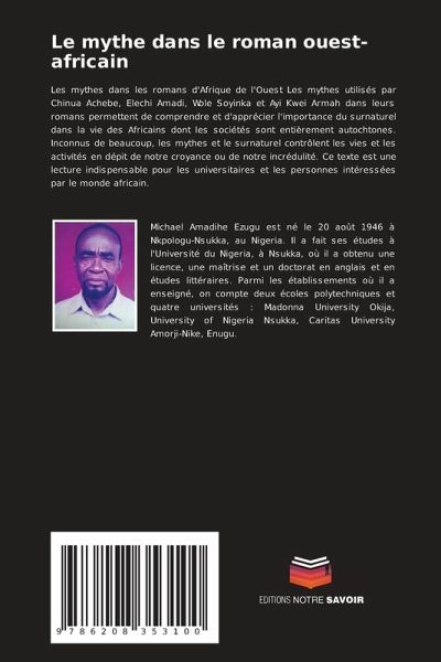 Les mythes dans les romans d'Afrique de l'Ouest Les mythes utilisés par Chinua Achebe, Elechi Amadi, Wole Soyinka et Ayi Kwei Armah dans leurs romans permettent de comprendre et d'apprécier l'importance du surnaturel dans la vie des Africains dont les sociétés sont entièrement autochtones. Inconnus de beaucoup, les mythes et le surnaturel contrôlent les vies et les activités en dépit de notre croyance ou de notre incrédulité. Ce texte est une lecture indispensable pour les universitaires et les personnes intéressées par le monde africain.