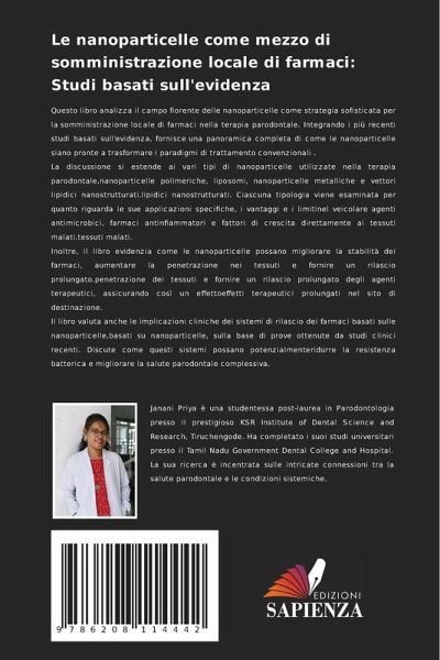 Questo libro analizza il campo fiorente delle nanoparticelle come strategia sofisticata per la somministrazione locale di farmaci nella terapia parodontale. Integrando i più recenti studi basati sull'evidenza, fornisce una panoramica completa di come le nanoparticelle siano pronte a trasformare i paradigmi di trattamento convenzionali . La discussione si estende ai vari tipi di nanoparticelle utilizzate nella terapia parodontale,nanoparticelle polimeriche, liposomi, nanoparticelle metalliche e vettori lipidici nanostrutturati.lipidici nanostrutturati. Ciascuna tipologia viene esaminata per quanto riguarda le sue applicazioni specifiche, i vantaggi e i limitinel veicolare agenti antimicrobici, farmaci antinfiammatori e fattori di crescita direttamente ai tessuti malati.tessuti malati.Inoltre, il libro evidenzia come le nanoparticelle possano migliorare la stabilità dei farmaci, aumentare la penetrazione nei tessuti e fornire un rilascio prolungato.penetrazione dei tessuti e fornire un rilascio prolungato degli agenti terapeutici, assicurando così un effettoeffetti terapeutici prolungati nel sito di destinazione.Il libro valuta anche le implicazioni cliniche dei sistemi di rilascio dei farmaci basati sulle nanoparticelle,basati su nanoparticelle, sulla base di prove ottenute da studi clinici recenti. Discute come questi sistemi possano potenzialmenteridurre la resistenza batterica e migliorare la salute parodontale complessiva.