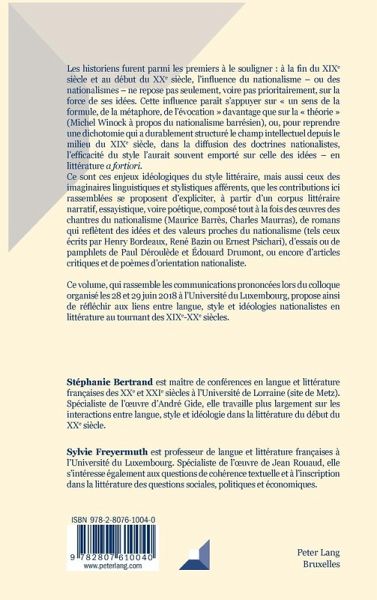 Ce volume, qui rassemble les communications prononcées lors du colloque organisé les 28 et 29 juin 2018 à l'Université du Luxembourg, propose ainsi de réfléchir aux liens entre langue, style et idéologies nationalistes en littérature au tournant des XIX e -XX e siècles.