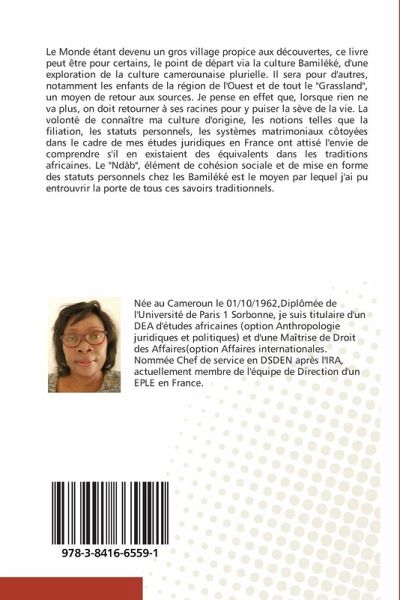 Le Monde étant devenu un gros village propice aux découvertes, ce livre peut être pour certains, le point de départ via la culture Bamiléké, d'une exploration de la culture camerounaise plurielle. Il sera pour d'autres, notamment les enfants de la région de l'Ouest et de tout le "Grassland", un moyen de retour aux sources. Je pense en effet que, lorsque rien ne va plus, on doit retourner à ses racines pour y puiser la sève de la vie. La volonté de connaître ma culture d'origine, les notions telles que la filiation, les statuts personnels, les systèmes matrimoniaux côtoyées dans le cadre de mes études juridiques en France ont attisé l'envie de comprendre s'il en existaient des équivalents dans les traditions africaines. Le "Ndàb", élément de cohésion sociale et de mise en forme des statuts personnels chez les Bamiléké est le moyen par lequel j'ai pu entrouvrir la porte de tous ces savoirs traditionnels.