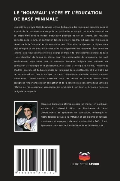 L'objectif de ce livre était d'analyser le type d'éducation des jeunes qui s'exprime dans et à partir de la contre-réforme du lycée, en particulier en ce qui concerne la composition du programme dans le réseau d'éducation publique de Rio de Janeiro. Les résultats compilés dans le livre, en particulier dans le dernier chapitre, indiquent les implications négatives de la "nouvelle" école secondaire pour l'éducation des jeunes. La législation a déjà souligné ce qui s'est matérialisé dans les programmes du réseau de l'État de Rio de Janeiro : une réduction massive de la charge de travail de l'enseignement général de base ; une réduction du temps de classe pour les composantes du programme qui sont extrêmement importantes pour la formation humaine intégrale des individus, en particulier la sociologie et la philosophie, mais aussi la biologie, la chimie, l'histoire et d'autres ; un concept d'éducation basé sur la logique des compétences, lié à un BNCC qui ne correspond en rien à ce que le camp progressiste conteste comme concept d'éducation ; parmi d'autres questions. Pour ces raisons et d'autres encore, nous soulignons l'importance de son abrogation et de la construction collective d'une véritable réforme de l'enseignement secondaire, qui privilégie à son tour la formation humaine intégrale de ce public.