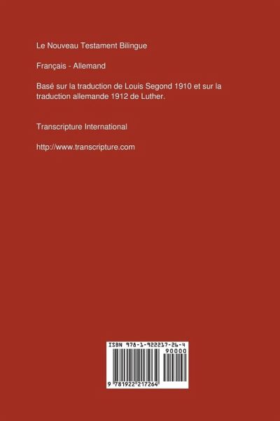 "Le Nouveau Testament Bilingue, Franc¿ais - Allemand" est basé sur la traduction de Louis Segond 1910 et sur la traduction allemande 1912 de Luther. Les textes ont été édités, ainsi les versets sont couplées en français puis, en allemand les rendant ainsi faciles à suivre et permettant la comparaison des deux langages. Exemples: Jean 3:16 "Car Dieu a tant aimé le monde qu`il a donné son Fils unique, afin que quiconque croit en lui ne périsse point, mais qu`il ait la vie éternelle." Johannes 3:16 "Also hat Gott die Welt geliebt, daß er seinen eingeborenen Sohn gab, auf daß alle, die an ihn glauben, nicht verloren werden, sondern das ewige Leben haben." Matthieu 28:18-20 "18. Je¿sus, s`e¿tant approche¿, leur parla ainsi: Tout pouvoir m`a e¿te¿ donne¿ dans le ciel et sur la terre. 19. Allez, faites de toutes les nations des disciples, les baptisant au nom du Pe¿re, du Fils et du Saint Esprit, 20. et enseignez-leur ä observer tout ce que je vous ai prescrit. Et voici, je suis avec vous tous les jours, jusqu`ä la fin du monde." Matthäus 28:18-20 "18. Und Jesus trat zu ihnen, redete mit ihnen und sprach: Mir ist gegeben alle Gewalt im Himmel und auf Erden. 19. Darum gehet hin und lehret alle Völker und taufet sie im Namen des Vaters und des Sohnes und des heiligen Geistes, 20. und lehret sie halten alles, was ich euch befohlen habe. Und siehe, ich bin bei euch alle Tage bis an der Welt Ende." Le couplage des versets peut produire une numérotation des versets qui diffère des Bibles standards. Des précautions doivent être prises quant à la comparaison de cette Bible avec d'autres Bibles. Table des matières: Matthieu - Matthäus Marc - Markus Luc - Lukas Jean - Johannes Actes - Die Apostelgeschichte Romains - Römer I Corinthiens - I Korinther II Corinthiens - II Korinther Galates - Galater Ephésiens - Epheser Philippiens - Philipper Colossiens - Kolosser I Thessaloniciens - I Thessalonicher II Thessaloniciens - II Thessalonicher I Timothée - I Timotheus II Timothée - II Timotheus Tite - Titus Philémon - Philemon Hébreux - Hebräer Jacques - Jakobus I Pierre - I Petrus II Pierre - II Petrus I Jean - I Johannes II Jean - II Johannes III Jean - III Johannes Jude - Judas Apocalypse - Offenbarung