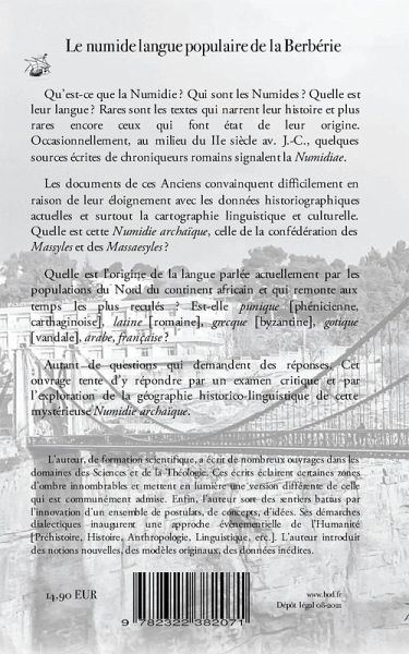 Qu'est-ce que la Numidie ? Qui sont les Numides ? Quelle est leur langue? Rares sont les textes qui narrent leur histoire et plus rares encore ceux qui font état de leur origine. Occasionnellement, au milieu du IIe siècle av. J.-C., quelques sources écrites de chroniqueurs romains signalent la Numidiae. Les documents de ces Anciens convainquent difficilement en raison de leur éloignement avec les données historiographiques actuelles et surtout la cartographie linguistique et culturelle. Quelle est cette Numidie archaïque, celle de la confédération des Massyles et des Massaesyles ? Quelle est l'origine de la langue parlée actuellement par les populations du Nord du continent africain et qui remonte aux temps les plus reculés ? Est-elle punique (phénicienne, carthaginoise), latine (romaine), grecque (byzantine), gotique (vandale), arabe, française ?Autant de questions qui demandent des réponses. Cet ouvrage tente d'y répondre par un examen critique et par l'exploration de la géographie historico-linguistique de cette mystérieuse Numidie archaïque.