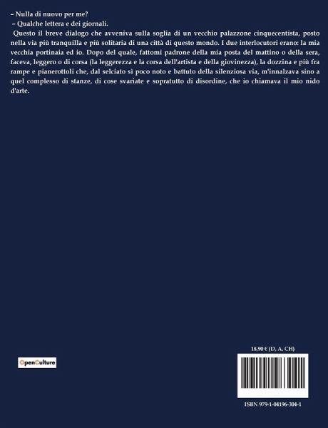 ¿ Nulla di nuovo per me? ¿ Qualche lettera e dei giornali. Questo il breve dialogo che avveniva sulla soglia di un vecchio palazzone cinquecentista, posto nella via più tranquilla e più solitaria di una città di questo mondo. I due interlocutori erano: la mia vecchia portinaia ed io. Dopo del quale, fattomi padrone della mia posta del mattino o della sera, faceva, leggero o di corsa (la leggerezza e la corsa dell'artista e della giovinezza), la dozzina e più fra rampe e pianerottoli che, dal selciato sì poco noto e battuto della silenziosa via, m'innalzava sino a quel complesso di stanze, di cose svariate e sopratutto di disordine, che io chiamava il mio nido d'arte.