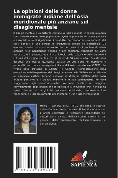 Il disagio mentale è un disturbo comune in tutto il mondo, in rapido aumento con l'invecchiamento della popolazione. Questo problema di salute pubblica è associato a livelli significativi di disabilità che comportano un aumento dei costi sanitari e una perdita di produttività sociale ed economica. Gli operatori sanitari si sono resi conto che, per prevenire i problemi di salute mentale nella popolazione anziana e per contenere l'aumento dei costi associati, è importante esaminare il ruolo della cultura e delle percezioni culturali del disagio mentale tra gli adulti di 60 anni e oltre. Questo libro descrive una ricerca qualitativa basata su una serie di interviste in profondità con donne immigrate indiane dell'Asia meridionale (SAIIW) che vivono nella provincia di Alberta, in Canada. Nell'esplorazione della percezione e dell'esperienza del disagio mentale delle SAIIW è stato utilizzato un approccio olistico. Acharya esamina le strategie adottate dalle SAIIW anziane per evitare il disagio mentale e le sue conseguenze. Fornisce suggerimenti agli operatori sanitari su come facilitare un maggiore coinvolgimento degli anziani che la società (sia in Canada che in India) ha spesso lasciato ai margini del processo decisionale, compresa la loro valutazione e il loro trattamento per mantenere uno stato mentale sano.