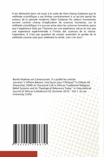 Il est démontré dans cet essai à la suite de Hans-Georg Gadamer que la méthode scientifique a ses limites contrairement à ce qu'ont pensé les auteurs de la période moderne. Selon Gadamer les valeurs humanistes servent comme champ d'explication de sciences humaines, car la méthode scientifique n'a aucune prise dans les sciences humaines parce que l'expérience faite par l'homme est une expérience vécue et non pas une expérience expérimentale à l'instar des sciences de la nature. Cependant, il n'est pas question de vouloir amoindrir la portée de la méthode comme voie pour atteindre la vérité. Loin s'en faut !