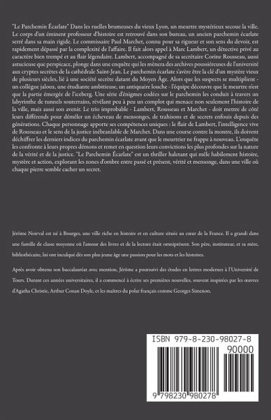 "Le Parchemin Écarlate" Dans les ruelles brumeuses du vieux Lyon, un meurtre mystérieux secoue la ville. Le corps d'un éminent professeur d'histoire est retrouvé dans son bureau, un ancien parchemin écarlate serré dans sa main rigide. Le commissaire Paul Marchet, connu pour sa rigueur et son sens du devoir, est rapidement dépassé par la complexité de l'affaire. Il fait alors appel à Marc Lambert, un détective privé au caractère bien trempé et au flair légendaire. Lambert, accompagné de sa secrétaire Corine Rousseau, aussi astucieuse que perspicace, plonge dans une enquête qui les mènera des archives poussiéreuses de l'université aux cryptes secrètes de la cathédrale Saint-Jean. Le parchemin écarlate s'avère être la clé d'un mystère vieux de plusieurs siècles, lié à une société secrète datant du Moyen Âge. Alors que les suspects se multiplient - un collègue jaloux, une étudiante ambitieuse, un antiquaire louche - l'équipe découvre que le meurtre n'est que la partie émergée de l'iceberg. Une série d'énigmes codées sur le parchemin les conduit à travers un labyrinthe de tunnels souterrains, révélant peu à peu un complot qui menace non seulement l'histoire de la ville, mais aussi son avenir. Le trio improbable - Lambert, Rousseau et Marchet - doit mettre de côté leurs différends pour démêler un écheveau de mensonges, de trahisons et de secrets enfouis depuis des générations. Chaque personnage apporte ses compétences uniques : le flair de Lambert, l'intelligence vive de Rousseau et le sens de la justice inébranlable de Marchet. Dans une course contre la montre, ils doivent déchiffrer les derniers indices du parchemin écarlate avant que le meurtrier ne frappe à nouveau. L'enquête les confronte à leurs propres démons et remet en question leurs convictions les plus profondes sur la nature de la vérité et de la justice. "Le Parchemin Écarlate" est un thriller haletant qui mêle habilement histoire, mystère et action, explorant les zones d'ombre entre passé et présent, vérité et mensonge, dans une ville où chaque pierre semble cacher un secret.
