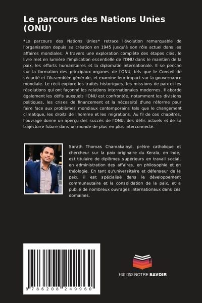 *Le parcours des Nations Unies* retrace l'évolution remarquable de l'organisation depuis sa création en 1945 jusqu'à son rôle actuel dans les affaires mondiales. À travers une exploration complète des étapes clés, le livre met en lumière l'implication essentielle de l'ONU dans le maintien de la paix, les efforts humanitaires et la diplomatie internationale. Il se penche sur la formation des principaux organes de l'ONU, tels que le Conseil de sécurité et l'Assemblée générale, et examine leur impact sur la gouvernance mondiale. Le récit explore les traités historiques, les missions de paix et les résolutions qui ont façonné les relations internationales modernes. Il aborde également les défis auxquels l'ONU est confrontée, notamment les divisions politiques, les crises de financement et la nécessité d'une réforme pour faire face aux problèmes mondiaux contemporains tels que le changement climatique, les droits de l'homme et les migrations. Au fil de ces chapitres, l'ouvrage donne un aperçu des succès de l'ONU, des défis actuels et de sa trajectoire future dans un monde de plus en plus interconnecté.