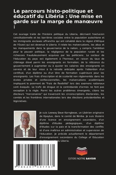 Cet ouvrage traite de l'histoire politique du Liberia, décrivant l'exclusion constitutionnelle et les barrières sociales entre la population autochtone et les immigrants esclaves affranchis qui ont cohabité dans la région d'Afrique de l'Ouest qui est devenue le Liberia. Il relate les malversations, les abus et les manquements dans la gouvernance de la nation, y compris l'ambition pour le pouvoir politique, la négligence de la population rurale et les richesses frauduleusement acquises par les politiciens. Le secteur de l'éducation du pays est également à l'honneur, en raison du taux de chômage élevé parmi les enseignants en formation, de la réticence du gouvernement à augmenter ou à ajuster les salaires des enseignants en service et de leur mise à la retraite anticipée après l'obtention d'un certificat, d'un diplôme ou d'un titre de formation supérieure pour les enseignants. Les frais d'inscription et de scolarité non réglementés dans les écoles privées et confessionnelles, les malversations académiques impliquant le paiement de "frais de flexibilité" lors des examens nationaux sont évoqués. Le trafic de drogue et la contrebande d'armes ne font pas exception à la règle. Parmi les autres problèmes émergents, citons les électeurs "mercenaires" qui traversent les circonscriptions électorales, les comtés et les frontières internationales lors des élections présidentielles et législatives.