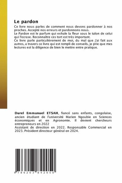 Ce livre nous parles de comment nous devons pardonner à nos proches. Accepté nos erreurs et pardonnons nous.Le Pardon est le parfum qui exhale la fleur sous le talon de celui qui l'ecrase. Reconnaître ces tort est très important.Ce livre parle particulièrement de moi, du mal que j'ai fait aux autres, a travers ce livre qui est rempli de conseils, je prie que mes lectures est la diligence de bien le mettre entre pratique.
