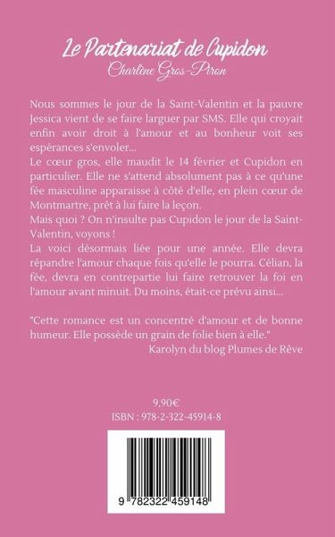 Quand la comédie romantique se pique d'imaginaire...Nous sommes le jour de la Saint-Valentin et la pauvre Jessica vient de se faire larguer par SMS. Elle qui croyait enfin avoir droit à l'amour et au bonheur voit ses espérances s'envoler... Le coeur gros, elle maudit le 14 février et Cupidon en particulier. Elle ne s'attend absolument pas à ce qu'une fée masculine apparaisse à côté d'elle, en plein coeur de Montmartre, prêt à lui faire la leçon. Mais quoi ? On n'insulte pas Cupidon le jour de la Saint-Valentin, voyons ! La voici désormais liée pour une année. Elle devra répandre l'amour chaque fois qu'elle le pourra. Célian, la fée, devra en contrepartie lui faire retrouver la foi en l'amour avant minuit. Du moins, était-ce prévu ainsi... "Cette romance est un concentré d'amour et de bonne humeur. Elle possède un grain de folie bien à elle." Karolyn du blog Plumes de Rêve