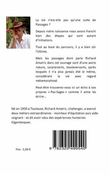 La vie n'est-elle pas qu'une suite de Passages ?Depuis notre naissance nous avons franchi bien des étapes qui sont autant d'initiations.Tout au bout du parcours, il y a bien sûr l'Ultime.Mais les passages dont parle Richard Amalric dans cet ouvrage sont d'une autre nature, surprenants, bouleversants, après lesquels il n'a plus jamais été le même, considérant la vie avec un regard métamorphosé.Peut-être trouverez-vous ici un écho à vos propres "Pas-Sages" comme il aime les écrire...