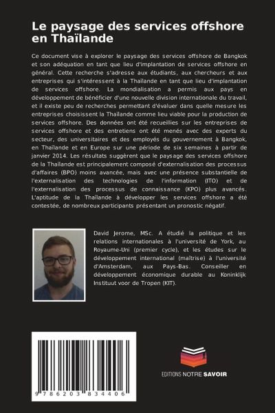 Ce document vise à explorer le paysage des services offshore de Bangkok et son adéquation en tant que lieu d'implantation de services offshore en général. Cette recherche s'adresse aux étudiants, aux chercheurs et aux entreprises qui s'intéressent à la Thaïlande en tant que lieu d'implantation de services offshore. La mondialisation a permis aux pays en développement de bénéficier d'une nouvelle division internationale du travail, et il existe peu de recherches permettant d'évaluer dans quelle mesure les entreprises choisissent la Thaïlande comme lieu viable pour la production de services offshore. Des données ont été recueillies sur les entreprises de services offshore et des entretiens ont été menés avec des experts du secteur, des universitaires et des employés du gouvernement à Bangkok, en Thaïlande et en Europe sur une période de six semaines à partir de janvier 2014. Les résultats suggèrent que le paysage des services offshore de la Thaïlande est principalement composé d'externalisation des processus d'affaires (BPO) moins avancée, mais avec une présence substantielle de l'externalisation des technologies de l'information (ITO) et de l'externalisation des processus de connaissance (KPO) plus avancés. L'aptitude de la Thaïlande à développer les services offshore a été contestée, de nombreux participants présentant un pronostic négatif.