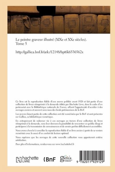 Le peintre graveur illustré (XIXe et XXe siècles). Tome 5 Date de l'édition originale: 1906-1926 Le présent ouvrage s'inscrit dans une politique de conservation patrimoniale des ouvrages de la littérature Française mise en place avec la BNF. HACHETTE LIVRE et la BNF proposent ainsi un catalogue de titres indisponibles, la BNF ayant numérisé ces oeuvres et HACHETTE LIVRE les imprimant à la demande. Certains de ces ouvrages reflètent des courants de pensée caractéristiques de leur époque, mais qui seraient aujourd'hui jugés condamnables. Ils n'en appartiennent pas moins à l'histoire des idées en France et sont susceptibles de présenter un intérêt scientifique ou historique. Le sens de notre démarche éditoriale consiste ainsi à permettre l'accès à ces oeuvres sans pour autant que nous en cautionnions en aucune façon le contenu. Pour plus d'informations, rendez-vous sur www.hachettebnf.fr