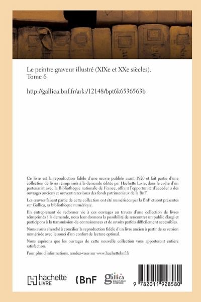 Le peintre graveur illustré (XIXe et XXe siècles). Tome 6 Date de l'édition originale: 1906-1926 Le présent ouvrage s'inscrit dans une politique de conservation patrimoniale des ouvrages de la littérature Française mise en place avec la BNF. HACHETTE LIVRE et la BNF proposent ainsi un catalogue de titres indisponibles, la BNF ayant numérisé ces oeuvres et HACHETTE LIVRE les imprimant à la demande. Certains de ces ouvrages reflètent des courants de pensée caractéristiques de leur époque, mais qui seraient aujourd'hui jugés condamnables. Ils n'en appartiennent pas moins à l'histoire des idées en France et sont susceptibles de présenter un intérêt scientifique ou historique. Le sens de notre démarche éditoriale consiste ainsi à permettre l'accès à ces oeuvres sans pour autant que nous en cautionnions en aucune façon le contenu. Pour plus d'informations, rendez-vous sur www.hachettebnf.fr