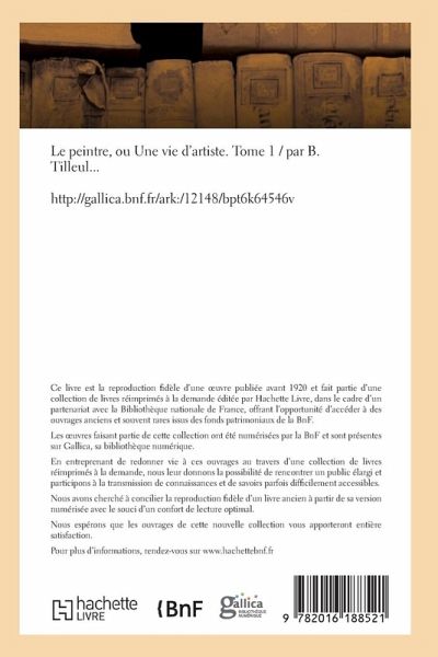 Le peintre, ou Une vie d'artiste. Tome 1 / par B. Tilleul... Date de l'édition originale: 1832 Le présent ouvrage s'inscrit dans une politique de conservation patrimoniale des ouvrages de la littérature Française mise en place avec la BNF. HACHETTE LIVRE et la BNF proposent ainsi un catalogue de titres indisponibles, la BNF ayant numérisé ces oeuvres et HACHETTE LIVRE les imprimant à la demande. Certains de ces ouvrages reflètent des courants de pensée caractéristiques de leur époque, mais qui seraient aujourd'hui jugés condamnables. Ils n'en appartiennent pas moins à l'histoire des idées en France et sont susceptibles de présenter un intérêt scientifique ou historique. Le sens de notre démarche éditoriale consiste ainsi à permettre l'accès à ces oeuvres sans pour autant que nous en cautionnions en aucune façon le contenu. Pour plus d'informations, rendez-vous sur www.hachettebnf.fr