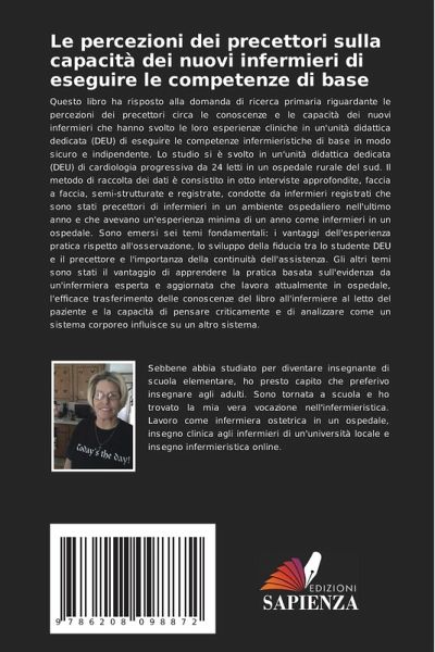 Questo libro ha risposto alla domanda di ricerca primaria riguardante le percezioni dei precettori circa le conoscenze e le capacità dei nuovi infermieri che hanno svolto le loro esperienze cliniche in un'unità didattica dedicata (DEU) di eseguire le competenze infermieristiche di base in modo sicuro e indipendente. Lo studio si è svolto in un'unità didattica dedicata (DEU) di cardiologia progressiva da 24 letti in un ospedale rurale del sud. Il metodo di raccolta dei dati è consistito in otto interviste approfondite, faccia a faccia, semi-strutturate e registrate, condotte da infermieri registrati che sono stati precettori di infermieri in un ambiente ospedaliero nell'ultimo anno e che avevano un'esperienza minima di un anno come infermieri in un ospedale. Sono emersi sei temi fondamentali: i vantaggi dell'esperienza pratica rispetto all'osservazione, lo sviluppo della fiducia tra lo studente DEU e il precettore e l'importanza della continuità dell'assistenza. Gli altri temi sono stati il vantaggio di apprendere la pratica basata sull'evidenza da un'infermiera esperta e aggiornata che lavora attualmente in ospedale, l'efficace trasferimento delle conoscenze del libro all'infermiere al letto del paziente e la capacità di pensare criticamente e di analizzare come un sistema corporeo influisce su un altro sistema.