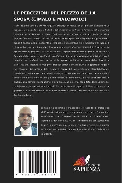 Il prezzo della sposa è uno dei requisiti principali in molte società per il matrimonio di un ragazzo. Utilizzando il caso di studio delle tribù etniche Ngoni e Tumbuka nella provincia orientale dello Zambia, il libro condivide le percezioni e gli atteggiamenti della popolazione nei confronti del prezzo della sposa in epoca contemporanea. Il prezzo della sposa è ancora una componente essenziale del matrimonio tra i Tumbuka e gli Ngoni. Il libro evidenzia che gli Ngoni e i Tumbuka intendono il Cimalo e il Malöolo (prezzo della sposa) come oggetti materiali o altri animali, oppure come denaro pagato dallo sposo alla famiglia della sposa in cambio di quest'ultima. Sia gli atteggiamenti positivi che quelli negativi nei confronti del prezzo della sposa cambiano a causa delle dinamiche capitalistiche. Tuttavia, la maggior parte dei partecipanti ha avuto atteggiamenti negativi nei confronti del prezzo della sposa a causa del suo contributo all'instabilità del matrimonio nelle case, alle disuguaglianze di genere tra le coppie, alla continua svalutazione della donna come partner minore nel matrimonio, alla violenza sessuale, ai divorzi, alla commercializzazione e alla pressione emotiva esercitata dagli uomini per mobilitare le risorse nei tempi attuali. Con molti aspetti negativi, il libro raccomanda al governo e ai leader tradizionali di riconsiderare il sistema del prezzo della sposa nello Zambia moderno.