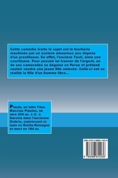Cette comédie traite le sujet est la fourberie machinée par un esclave amoureux aux dépens d'un prostitueur. En effet, l'esclave Taxil, aime une courtisane. Pour pouvoir lui trouver de l'argent, un de ses camarades se déguise en Perse et prétend vouloir vendre une jeune fille enlevée. Celle-ci est en réalité la fille d'un homme libre...