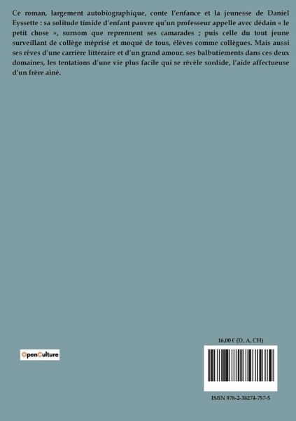 Ce roman, largement autobiographique, conte l¿enfance et la jeunesse de Daniel Eyssette : sa solitude timide d¿enfant pauvre qüun professeur appelle avec dédain « le petit chose », surnom que reprennent ses camarades ; puis celle du tout jeune surveillant de collège méprisé et moqué de tous, élèves comme collègues. Mais aussi ses rêves d¿une carrière littéraire et d¿un grand amour, ses balbutiements dans ces deux domaines, les tentations d¿une vie plus facile qui se révèle sordide, l¿aide affectueuse d¿un frère aîné.