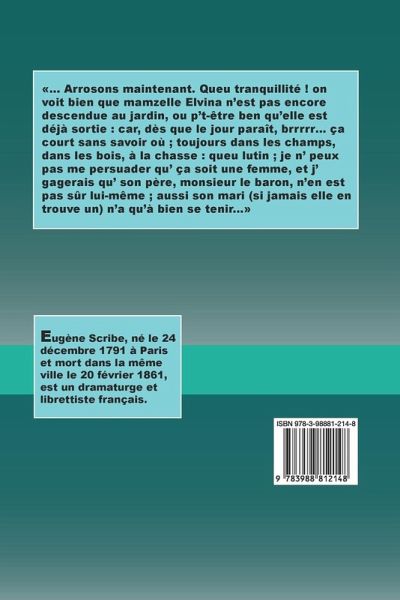 ... Arrosons maintenant. Queu tranquillité ! on voit bien que mamzelle Elvina n'est pas encore descendue au jardin, ou p't-être ben qu'elle est déjà sortie : car, dès que le jour paraît, brrrrr... ça court sans savoir où ; toujours dans les champs, dans les bois, à la chasse : queu lutin ; je n' peux pas me persuader qu' ça soit une femme, et j' gagerais qu' son père, monsieur le baron, n'en est pas sûr lui-même ; aussi son mari (si jamais elle en trouve un) n'a qu'à bien se tenir...