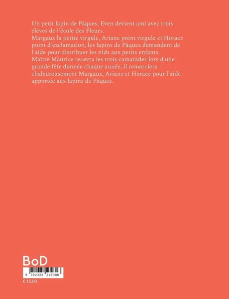 Un petit lapin de Pâques, Even devient ami avec trois élèves de l'école des Fleurs.Margaux la petite virgule, Ariane point virgule et Horace point d'exclamation, les lapins de Pâques demandent de l'aide pour distribuer les nids aux petits enfants.Maître Maurice recevra les trois camarades lors d'une grande fête donnée chaque année, il remerciera chaleureusement Margaux, Ariane et Horace pour l'aide apportée aux lapins de Pâques.