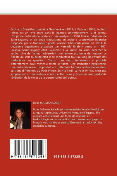 Écrit aux États-Unis, publié à New York en 1943, à Paris en 1946, Le Petit Prince est un livre entré dans la légende, universellement lu et connu. L'objet de notre étude porte sur une analyse du Petit Prince d'Antoine de Saint-Exupéry et de deux traductions en arabe : la première libanaise proposée par le traducteur poète Youssef Ghassoub parue en 1963, la deuxième égyptienne proposée par Hamada Ibrahim parue en 1967. Puisque Saint-Exupéry était lui-même à la quête du sens, décerner le vouloir dire de l'auteur nécessitait une lecture profonde de l' uvre. La fidélité au sens du texte était le fil conducteur tout au long de l'étude des traductions en question. Chacun des deux traducteurs a procédé différemment pour mener à terme sa tâche. Une traduction égyptienne, une autre libanaise, proposent aux différents lecteurs arabophones deux versions différentes du Petit Prince. Écrit à l'exil, Le Petit Prince, n'est pas simplement un merveilleux conte de fée, nous y trouvons une profonde révélation de la vie et de la personnalité de l'auteur.