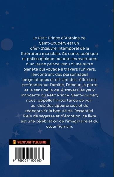 Le Petit Prince d'Antoine de Saint-Exupéry est un chef-d'oeuvre intemporel de la littérature mondiale. Ce conte poétique et philosophique raconte les aventures d'un jeune prince venu d'une autre planète qui voyage à travers l'univers, rencontrant des personnages énigmatiques et offrant des réflexions profondes sur l'amitié, l'amour, la perte et le sens de la vie. À travers les yeux innocents du Petit Prince, Saint-Exupéry nous rappelle l'importance de voir au-delà des apparences et de redécouvrir la beauté de l'essentiel. Plein de sagesse et d'émotion, ce livre est une célébration de l'imaginaire et du coeur humain.