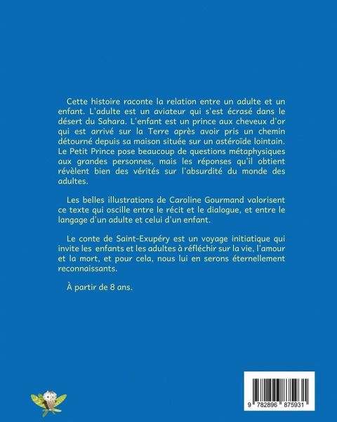 Cette histoire raconte la relation entre un adulte et un enfant. L'adulte est un aviateur qui s'est écrasé dans le désert du Sahara. L'enfant est un prince aux cheveux d'or qui est arrivé sur la Terre après avoir pris un chemin détourné depuis sa maison située sur un astéroïde lointain. Le Petit Prince pose beaucoup de questions métaphysiques aux grandes personnes, mais les réponses qu'il obtient révèlent bien des vérités sur l'absurdité du monde des adultes. Les belles illustrations de Caroline Gourmand valorisent ce texte qui oscille entre le récit et le dialogue, et entre le langage d'un adulte et celui d'un enfant. Le conte de Saint-Exupéry est un voyage initiatique qui invite les enfants et les adultes à réfléchir sur la vie, l'amour et la mort, et pour cela, nous lui en serons éternellement reconnaissants. À partir de 8 ans. Cette édition est bien adaptée pour les plus jeunes lecteurs ; la police utilisée est plus grande et l'espace entre les mots et les lignes est plus important ce qui permet une fluidité de lecture.