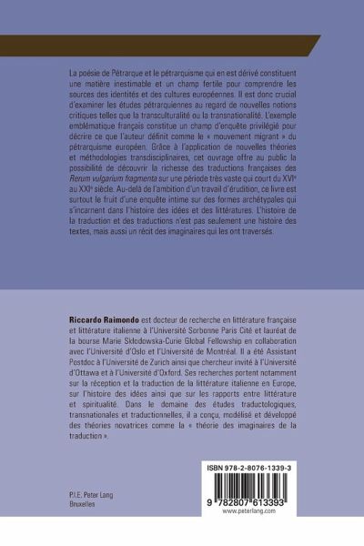 Cette étude traite des premières traductions françaises des Rerum vulgarium fragmenta de Pétrarque (XVI-XVIIe s.) et de leur influence sur celles réalisées au cours des siècles suivants. L'ouvrage analyse et compare ces traductions au fil de l'histoire et met en évidence une «tradition traductionnelle» s'étendant sur dix siècles.