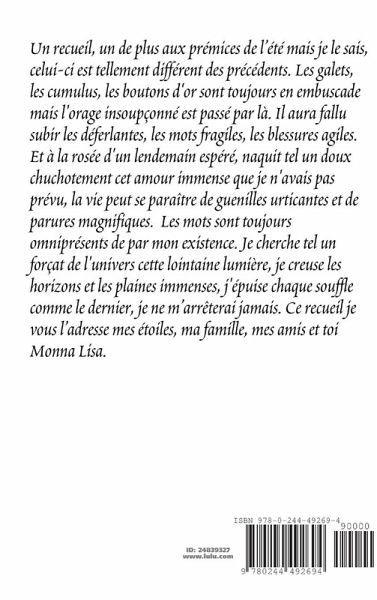 Un recueil, un de plus aux prémices de l'été mais je le sais, celui-ci est tellement différent des précédents. Les galets, les cumulus, les boutons d'or sont toujours présents mais l'orage insoupçonné est passé par là. Il aura fallu subir les déferlantes, les mots fragiles, les blessures agiles. Et à la rosée d'un lendemain espéré naquit de par ces arbrisseaux cet amour immense que je n'avais pas prévu, la vie peut se paraître de guenilles urticantes et de parures magnifiques. Les mots sont toujours omniprésents de par mon existence. Je cherche tel un forçat de l'univers cette lointaine lumière, je creuse les horizons et les plaines immenses, j'épuise chaque souffle comme le dernier, je ne m'arrêterai jamais. Ces proses je les souffle sur la voile de ma vie, je vous les adresse mes étoiles, ma famille, mes amis et toi Monna Lisa.