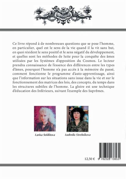 Ce livre répond à de nombreuses questions que se pose l'homme, en particulier, quel est le sens de la vie quand il la vit sans but, en quoi résident le sens positif et le sens négatif du développement, et quelles sont les méthodes de lutte pour la conquête des âmes utilisées par les systèmes d'opposition du Cosmos.Le lecteur prendra connaissance de l'essence des différences entre les types d'âmes, pourquoi l'homme n'a pas accès à la mémoire du passé, comment fonctionne le programme d'auto-apprentissage, ainsi que l'information sur les situations sans issue dans la vie et sur le fonctionnement des matrices des lois, des concepts, du temps dans les structures subtiles de l'homme. La gloire est une technique d'éducation des Inférieurs, suivant l'exemple des suprêmes.
