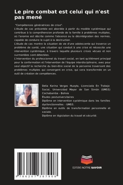 "Compétences génératrices de crise".L'étude de cas présentée est abordée à partir du modèle systémique qui contribue à la compréhension profonde de la famille à problèmes multiples, où l'anomie est décrite comme l'absence ou la désintégration des normes, capable de conduire le sujet à la destruction.L'étude de cas montre la situation de vie d'une adolescente qui traverse un problème de santé, une situation qui conduit à une crise et nécessite une intervention systémique, à travers laquelle plusieurs crises vécues et non surmontées sont détectées.L'intervention du professionnel du travail social, en tant qu'élément principal pour la conformation et l'intervention de l'équipe interdisciplinaire, avec pour seul objectif la recherche du bien-être social de la personne traversant des problèmes multiples qui convergent en crise, qui sera transformée en un outil de création de compétences.