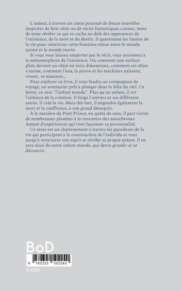 L'auteur, à travers un conte ponctué de douze nouvelles inspirées de faits réels ou de récits fantastiques connus, tente de nous révéler ce qui se cache au-delà des apparences de l'existence, de la mort et du destin. Il questionne les limites de la vie pour relativiser cette frontière ténue entre le monde animé et le monde inerte. Si vous vous laissez emporter par le récit, vous assisterez à la métamorphose de l'existence. Ou comment une surface pliée devient un objet en trois dimensions, comment cet objet s'anime, comment l'eau, la pierre et les machines naissent, vivent, et meurent... Pour explorer ce livre, il vous faudra un compagnon de voyage, un aventurier prêt à plonger dans la folie du réel. Ce héros, ce sera "l'enfant monde". Plus qu'un enfant, il est l'enfance de la création. Il forge l'univers et ses différents astres. Il crée la vie. Mais dès lors, il engendre également la mort et la souffrance, à son grand désespoir. À la manière du Petit Prince, en quête de sens, il part visiter de nombreuses planètes et rencontrer les autochtones. Autant d'expériences qui vont façonner sa personnalité. Ce texte est un cheminement à travers les paradoxes de la vie qui participent à la construction de l'individu et vont jusqu'à structurer son esprit et révéler sa propre nature. Il en sera ainsi de notre enfant monde, qui devra grandir et se découvrir.