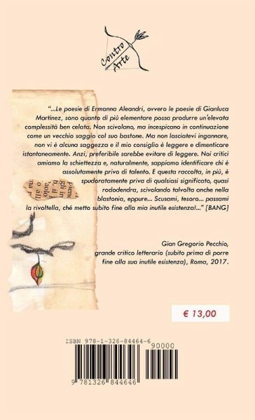 Le poesie brevi di Ermanna Aleandri, raccolta poetica di Gianluca Martinez, 40 liriche in versi sciolti su attimi e frammenti di pensiero senza filtro, composte tra il 1996 e il 2016, nel contesto urbano di una Torino più che mai decadente. Liriche scarne, liriche assenti, sguardi asciutti verso dettagli privi di forme. La poesia contemporanea come prospettiva di espressione libera da modelli, tendenze, contenuti e contenitori, introspettiva e disincantata, eppur densa di speranza e amorevole verso un disastroso eppur meraviglioso futuro.