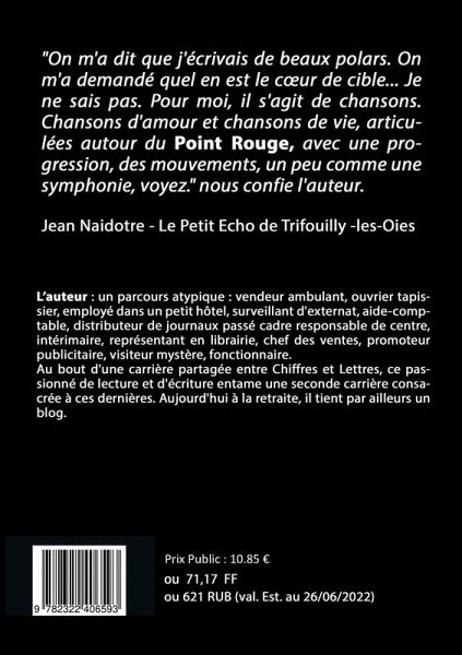 "On m'a dit que j'écrivais de beaux polars. On m'a demandé quel en est le coeur de cible... Je ne sais pas. Pour moi, il s'agit de chansons. Chansons d'amour et chansons de vie, articulées autour du Point Rouge, avec une progression, des mouvements, un peu comme une symphonie, voyez", nous confie l'auteur.Jean Naidotre - Le Petit Echo de Trifouilly-les-Oies